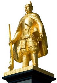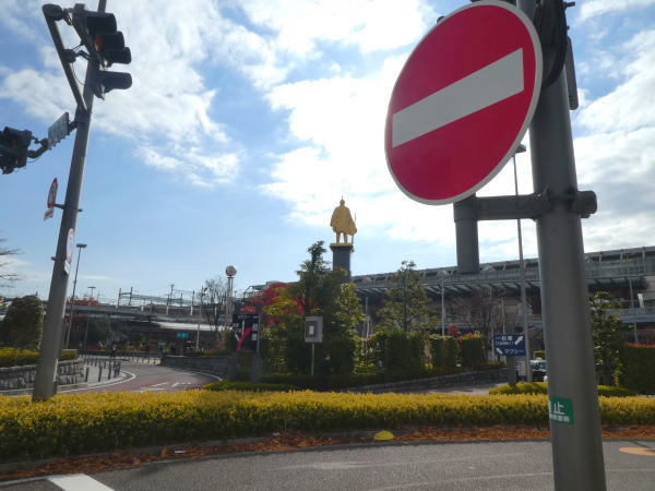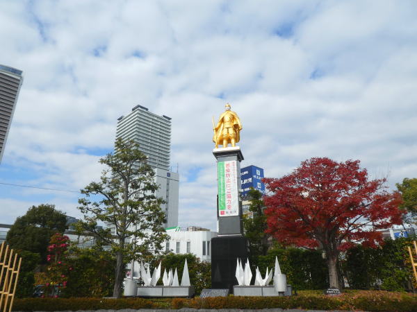 | 10:00のホテル送迎バスで岐阜駅へ。約10分で到着。 岐阜駅前には黄金の織田信長像がそびえている。 |