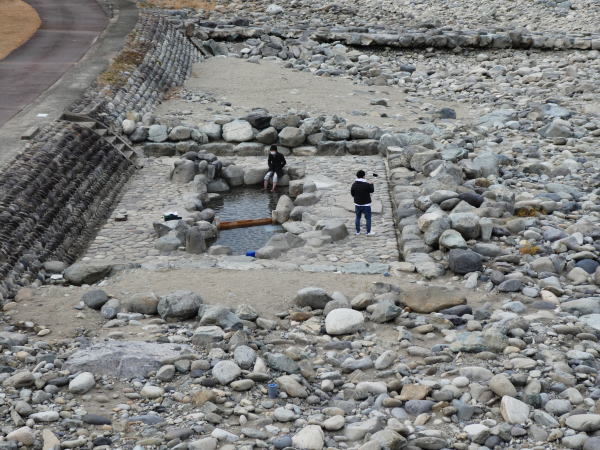 | 下呂大橋を渡り駅に向かう。橋の下に名物・噴泉池(下呂温泉の源泉)が見える。囲いもなく開放感抜群、現在は足湯専用になり裸の入浴は禁じられているが、裸になり源泉を堪能入浴する強者があとを絶たないらしい。 |