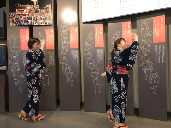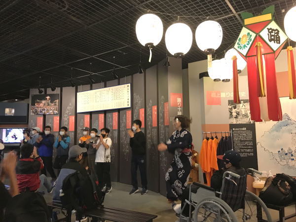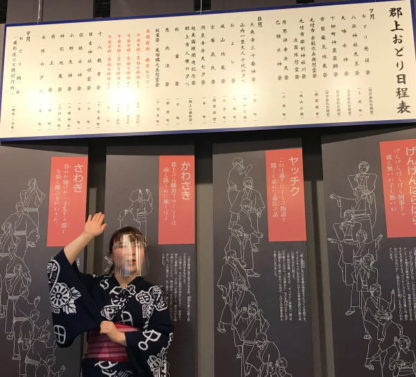 10種ある「郡上踊り」を丁寧に実演を混ぜながら説明してくれる。 その後は見学者も一緒に「郡上踊り」を踊る。 |