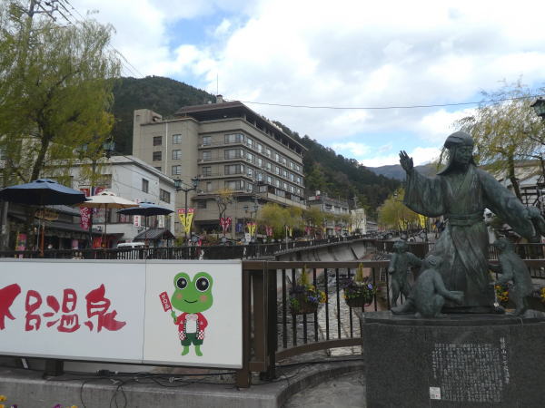 湯之島館から坂道を下って温泉寺に向かう。後ろから送迎バスが横を通る、車内からさっきのご夫婦が笑顔で大きく手を振って去って行った。明るく楽しいいい一日のスタート。 |