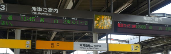 岐阜駅は県庁所在地の中央駅らしく斬新なデザインであか抜けた立派な駅舎。 岐阜駅から11:45分高山行の電車に乗って下呂に向かう。 |