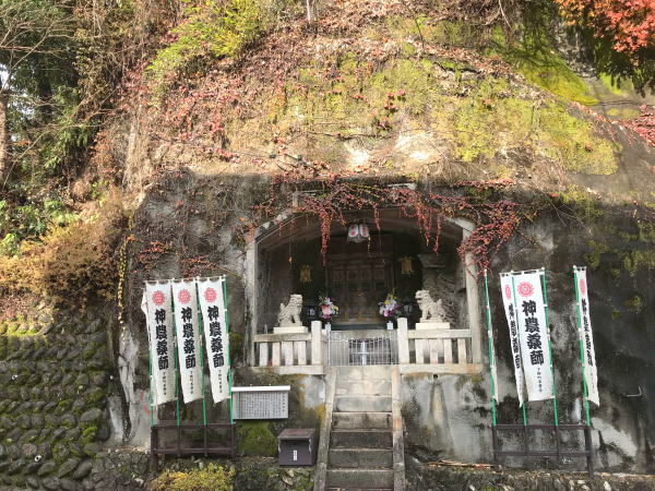 | 「郡上八幡旧庁舎記念館」から吉田川・新橋を渡ると正面に洞窟の中に珍しい形をした「神農薬師」 その前を左に曲がって、出発した城下町プラザ方面へもどる。 |