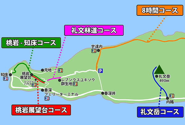 今日歩くのは桃岩・知床・桃岩展望台コースと知床から海沿いを歩いてフェリーターミナルとホテルまでのルート。