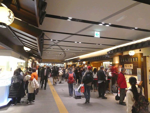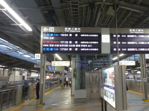 大阪駅から電車で新大阪に向かう。1時間ほど改札入った待合で時間をつぶし、16:30頃出発する24番線ホームに上がる。ぷらっとこだまの列はどこも行列ができ乗客の多いのに少し驚く。列車が到着乗車して、大阪で買って用意した早めの夕食。あちこちの席も皆同様にお弁当ひろげる人多数。東京までは4時間近くかかるがうとうとしてあっという間に到着する。