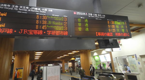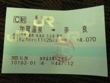 加賀温泉駅発10:28分福井行電車に乗り、11:02分福井駅着、11:12分の敦賀行に乗換えて、12:04分敦賀駅着、ここでまた乗換えて、12:23発京都行で、13:58分京都駅着、今日最後の乗換え。京都駅発14:03分の奈良で、14:48分目的地の奈良駅に到着した。特急乗らないで安く移動する移動は時間はかかるが、いろいろな駅の様子や車窓風景が見れて楽しい。(特急料金4400円が節約できた)