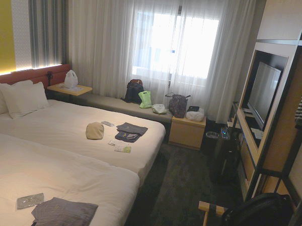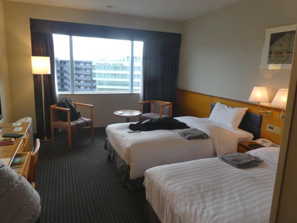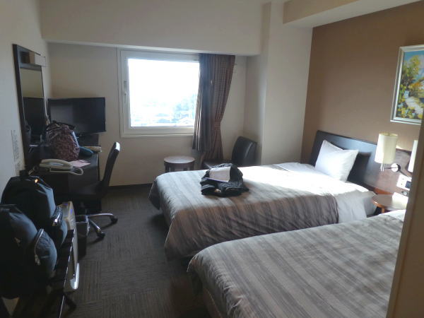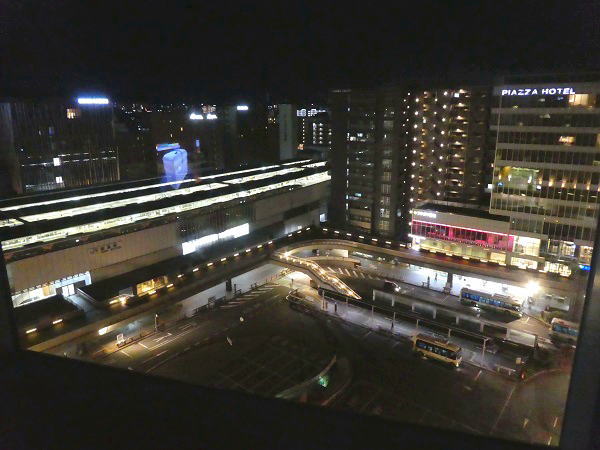 一か月前の予約時に「70代夫婦ですが、できるだけ静かな部屋を」とリクエストしたので配慮してくれたのか、最上階の角部屋の1046号室。左下に奈良駅、右は奈良市街から山々の見渡せる眺めのいい部屋。