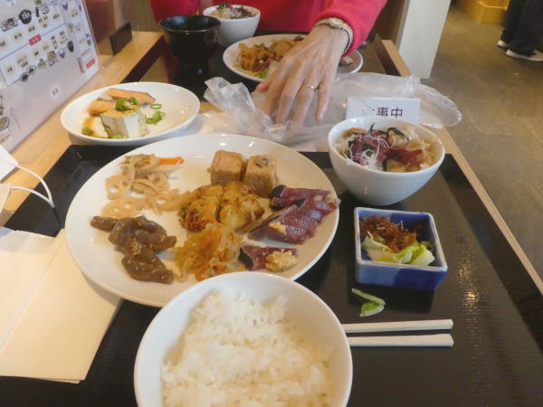 新幹線は新大阪16:54分なので夕食お弁当などを買いに阪神デパート地下へ寄る。K=太巻と焼サバ寿司、M=手毬すしお弁当を買う。