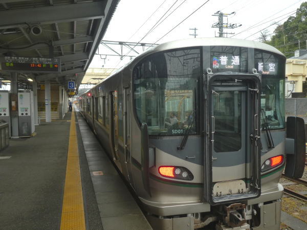 地下鉄四条駅8:30分へ。京都駅⑤8:43姫路行は混んでいて大阪駅まで立ったまま。9:12分大阪で乗換、①9:19分 発和歌山行で10:53分和歌山着、3回目の乗換⑤で、10:55分御坊行き、11:56分御坊着、11:58分紀伊田辺行で12:48分紀伊田辺着。ここで最後の6回目の乗換をする。