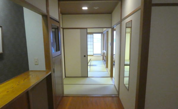 広い玄関を入り、正面に12.5帖、右に8帖の和室。