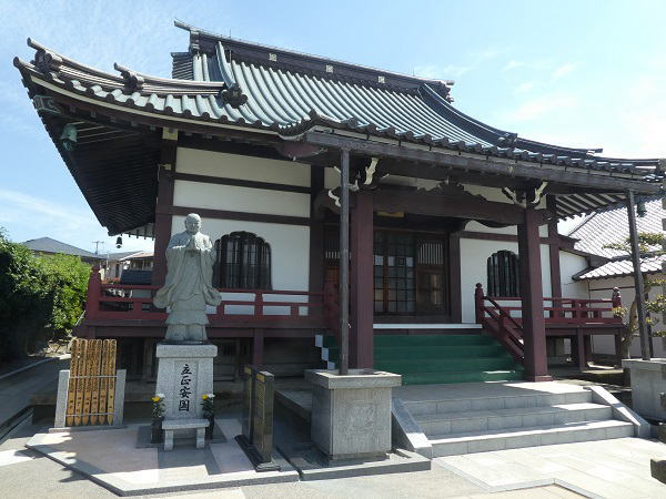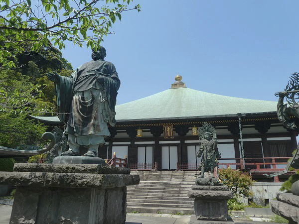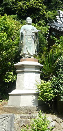 長勝寺.本堂(帝釈堂)前に上野公園の西郷隆盛像製作した高村光雲作の「日蓮聖人像」 |