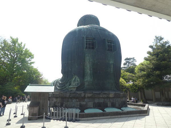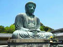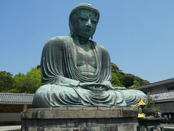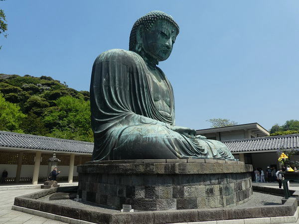 | .「露坐の大仏」として名高い高徳院の本尊、国宝銅造阿弥陀如来坐像。像高約11.3m、重量約121t を測るこの仏像は、規模こそ奈良東大寺の大仏(