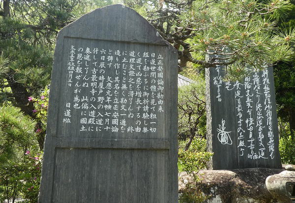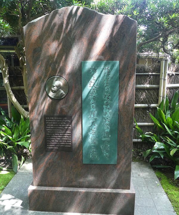 安国論寺境内に正岡子規の歌碑、「鎌倉の松葉が谷の道の辺に法を説きたる日蓮大菩薩」 子規は1888年(明治21年)と1893年(明治26年)に鎌倉を訪れ、安国論寺へ足を運んだ。 |
