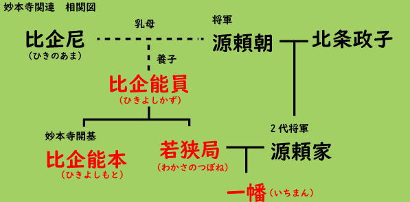 「比企の乱」の時、幼少で京都にいたため生き延びたのが、比企能員の末子、能本だった。能本は当時鎌倉の辻に立ち生命がけの布教をする日蓮聖人に出会い「わが一族の菩提を弔って下さるのは、このお聖人しかいない」と自分の屋敷を日蓮聖人に献上したのが妙本寺の始まり。 |
