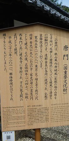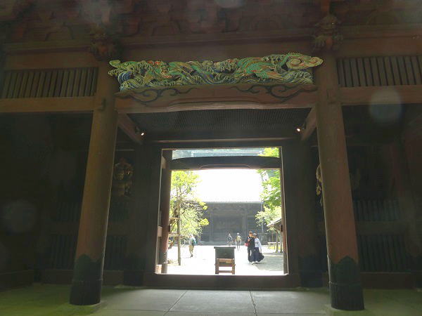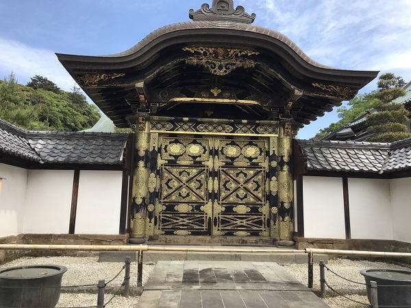 唐門は、1628年、東京・芝・増上寺で徳川二代将軍秀忠正室お江の方の=墓のお堂の門として建てられ、1647年、建長寺に寄附され、龍王殿の正門として使用されている。 |