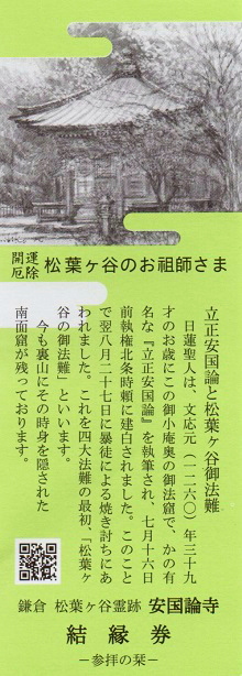| 安国論寺について..........安国論寺HPより転載 建長五(1253)年安房国から鎌倉入りした日蓮聖人が草庵を結ばれた場所に創建されました。ここで国の安泰と人々の幸せを願い『立証安国論』を執筆されました 境内には 日蓮聖人が草庵としてお住まいになり 当山の元となった「御法窟」と呼ばれる岩窟『立正安国論』を幕府に進献したことに反感を持つ人々に襲われた「松葉ヶ谷の法難」の際に山王権現の使いとされる白猿の導きで難を逃れ一時避難した「南面窟」等があります。 |