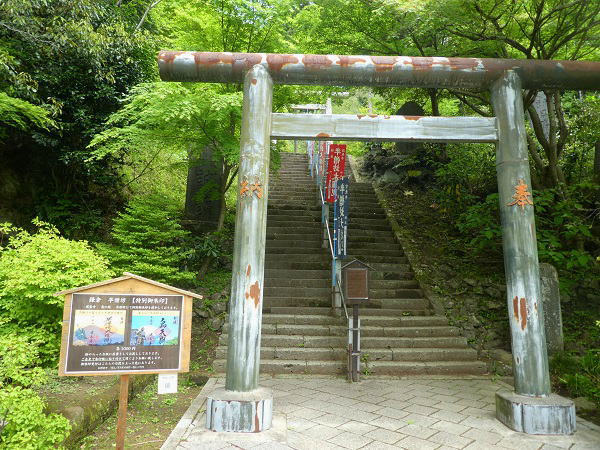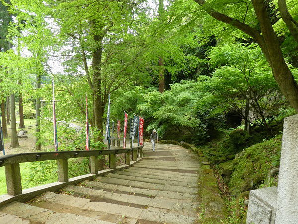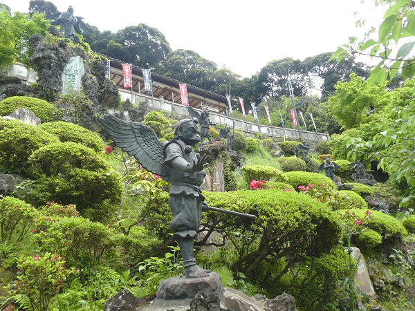 長い石段を上がっていくと、半増坊大権現の天狗像が13体並んでいる広場に出る。 ベンチに腰かけて水分補給とお昼にする。 |