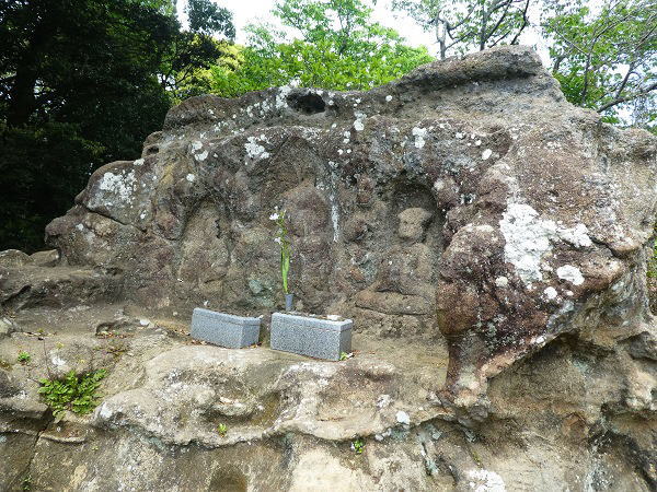 鎌倉のパワースポット十王岩は鶴岡八幡宮の真北に位置して、風雪によってとぼれているが、岩に十王像が3体刻まれている |