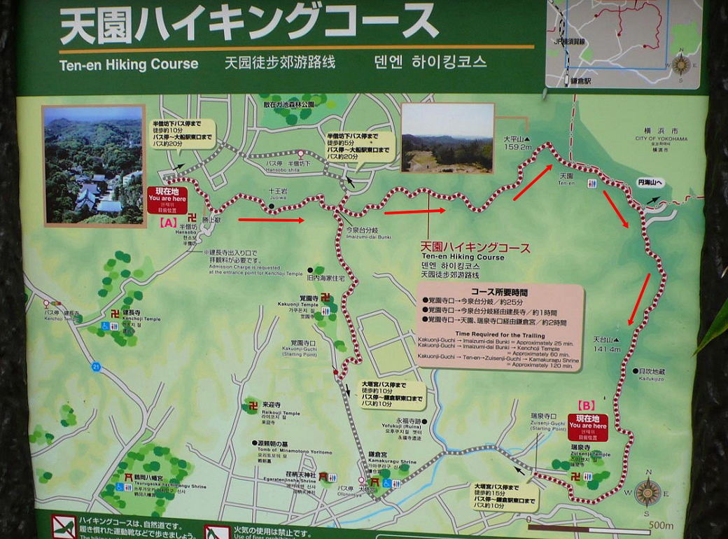 建長寺(A) から大平山.山頂を経由して瑞泉寺(B) まで天園ハイキングコース |