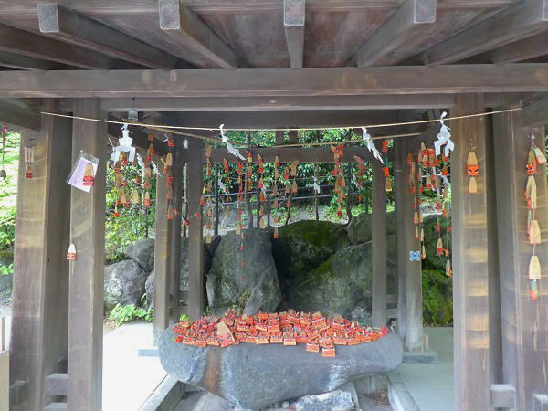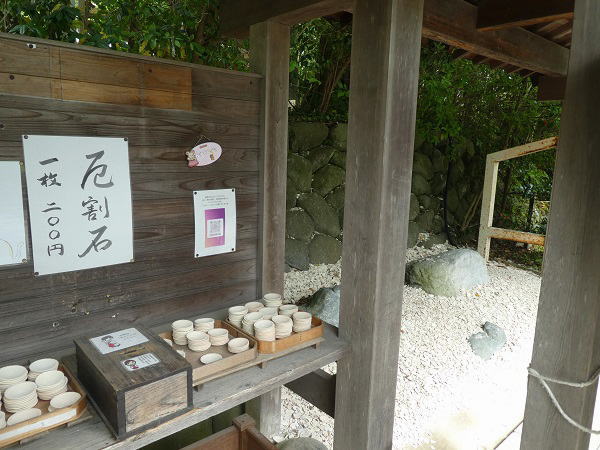 | 厄割石↑は「かわらけ」を石に投げつけ割ることで厄払いする。 |