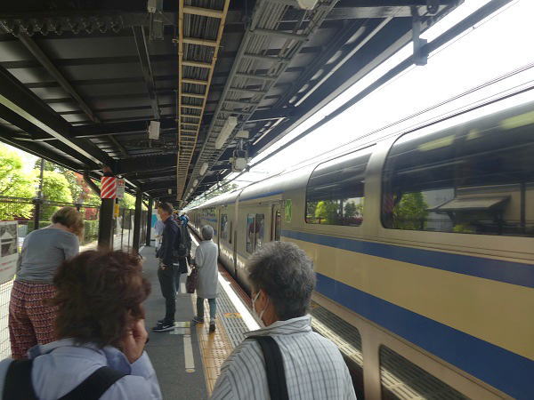 本興寺から鎌倉大仏へ、初夏のような暑さの中、今日一番の長丁場、40分ほど歩く。江ノ電由比ガ浜駅横を抜けて大仏まで あと一息。 |