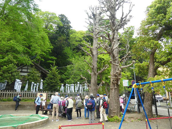 | 鎌倉宮から10分くらい歩くと、源頼朝公の墓前にくる。入口にある児童公園で休憩。 お参り終えたらしき、同年配の団体さんが公園で休憩していた。 |