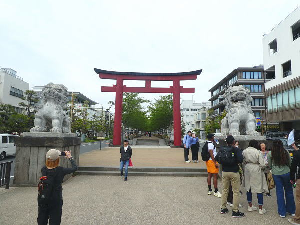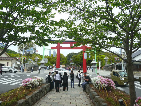 Mの両太もも痛で鶴岡八幡宮の石段を上るのはちょっと無理、石段下から手を合わせて帰ることにする。 |