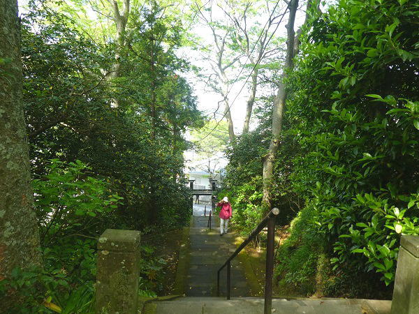源頼朝公の墓は平家を滅ぼし鎌倉幕府を開いた人の墓所としてはあまりに小ぶり質素に少々驚きながらお参りする、が その最中、Mが両太ももに激痛に、顔をしかめ痛みに耐えながら、しばらく動けない.......... しばらくそのまま、痛みがやわらぐのを待つ。だいぶして、なんとか立ち上がり一歩一歩、だましだまし石段を下る。なんとか石段下の平坦な道路に辿り着き、鶴岡八幡宮方面にゆっくり向かう。 |