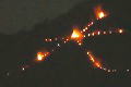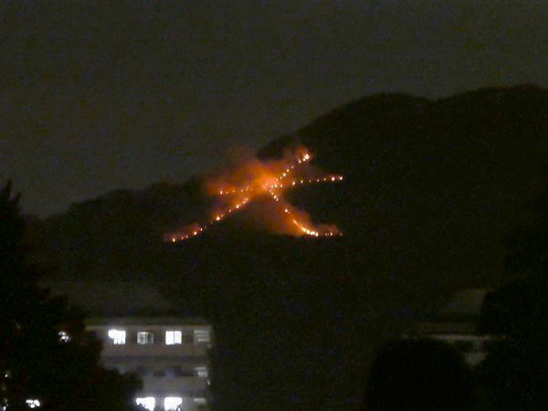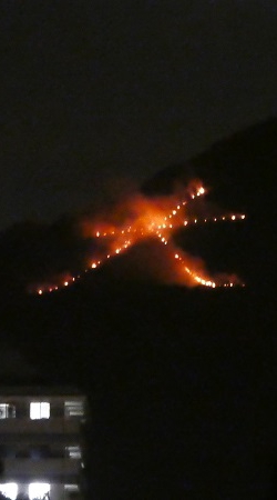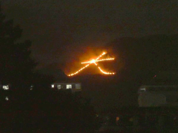 午後八時、送り火の最初、大の字に火が灯り始める。 |
