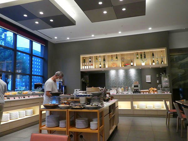 アーバンホテルの朝食は一階レストランで。台風来襲の影響で館内はとても静か。 レストランは京都の食材を使ってとても美味しい。 |