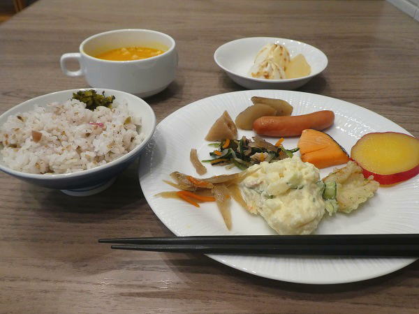 予定では8:30~朝食だったが6時~一番で一階レストランへ、空いていてゆっくり食べる。玄米ご飯や焼き魚野菜の煮物、コーンスープ、カレーライス食べて、ジュース牛乳、デザートは和菓子など。 |
