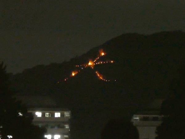 徐々に灯りも大きくなり、遠く大文字山腹に「大」の火が勢いよく燃え浮き上がってくる。 |