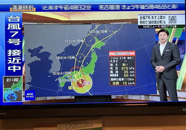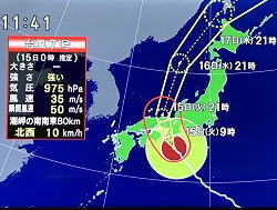 | しかし風雲急を告げる! 明日は一日かけて梅田地下街をどこまで制覇できるか歩いてみる予定だったが、天気予報は大型台風7号が進路を近畿地方に向け北上し、大阪・京都直撃の様相。 状況は差し迫って風雲急を告げる。 大阪には、13日.14日 2泊して、3日目の15日、京都に移動する予定だったが、その日に台風が近畿地方を直撃、報道では JR西日本は15日始発から運転休止予定! 15日京都へ移動できない。そこで一日前倒して明日14日に京都へ移動を決める。 |
