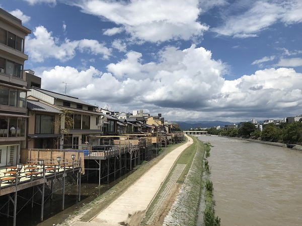四条大橋に流れる鴨川は、台風通過後で清流が濁流となっていた。 |