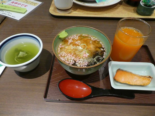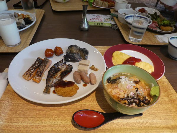 | 6時半ホテルに戻りそのまま一階レストランで朝食。 格安ホテルだが一応食材は整い昨日まで滞在した京都のホテルに負けない内容にうれしかった。 |