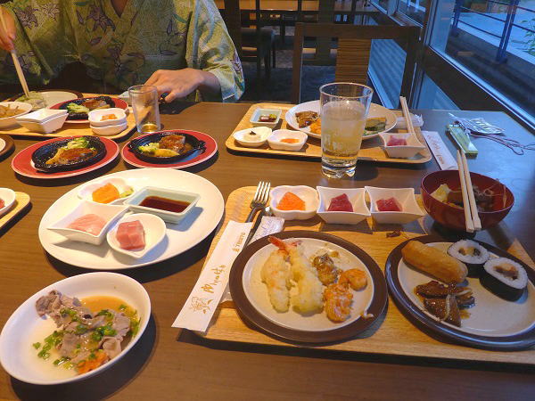 お風呂に入って17時半~二階のバイキングレストラン「山のかまど」で。夕食後はもう一度お風呂おに入り9時寝る。 |