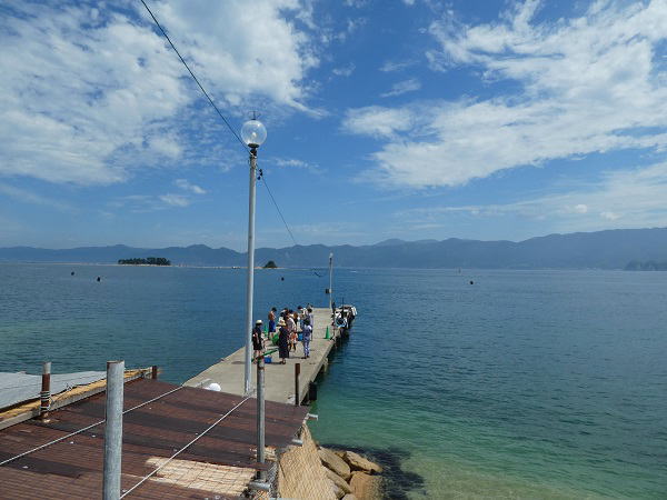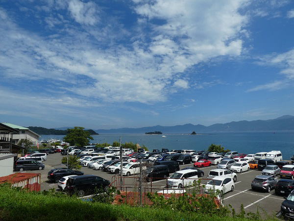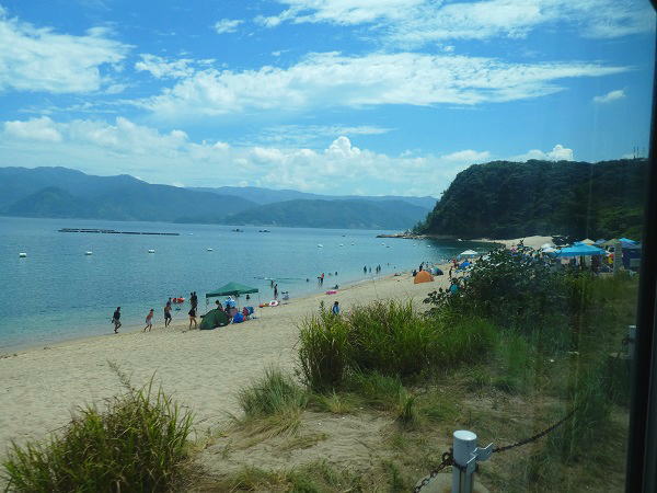 10:05分、敦賀駅前からコミュニティバスに乗り 30分、色ヶ浜バス停で下車。 この時間のバスは8月だけの土・日臨時便で、海水浴の家族が多数乗ってほとんどここで下車した。 |