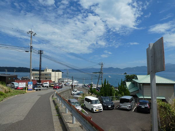 目の前の色ヶ浜海岸へ坂道を下っていく。澄んだ海の色がきれい。 |
