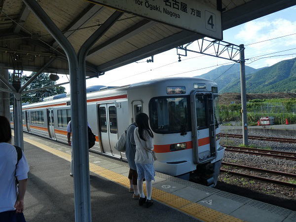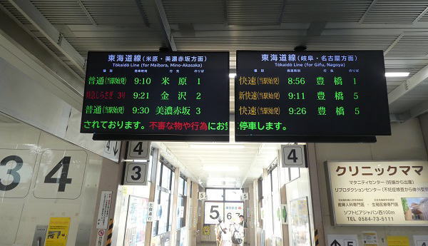 間違いに気づいたが後の祭り、米原駅9:45分着。豊橋に行くのには、もう一度大垣に戻り豊橋方面の電車に乗換えるしか方法がない。幸い11分後に大垣行の電車がありそれに乗換える。 |