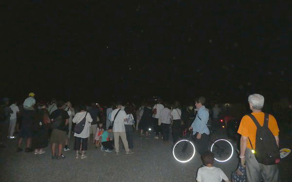 午後7時半、送り火の点火開始は午後八時ちょうど。まだ30分程ある。 暗闇の中にベンチを見つけ掛けて待つ。八時五分前、人の波が徐々に動き始めた。 |