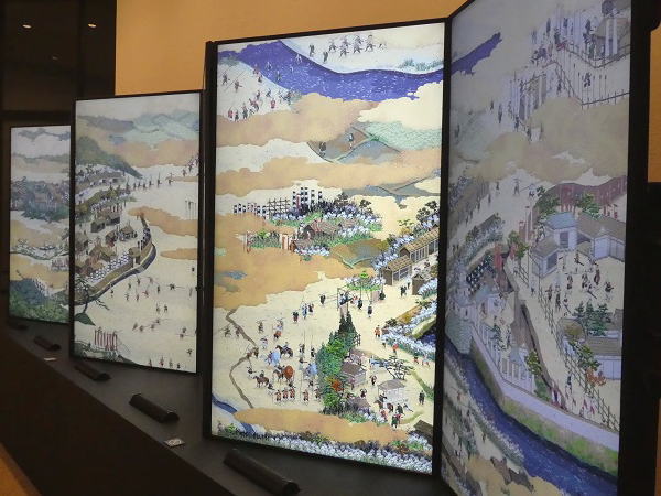 | それにしても暑い。無風で日傘をさしてもアスファルト道路上は40℃越えてるのではないかと感ずる。その道を歩いて10分ほどやっと「関ケ原古戦場記念館」へ到着。500円支払い館内へ。灼熱の歩道から記念館は冷房がきいて天国のよう。 |