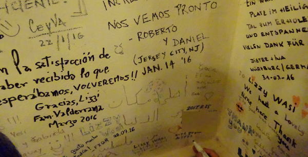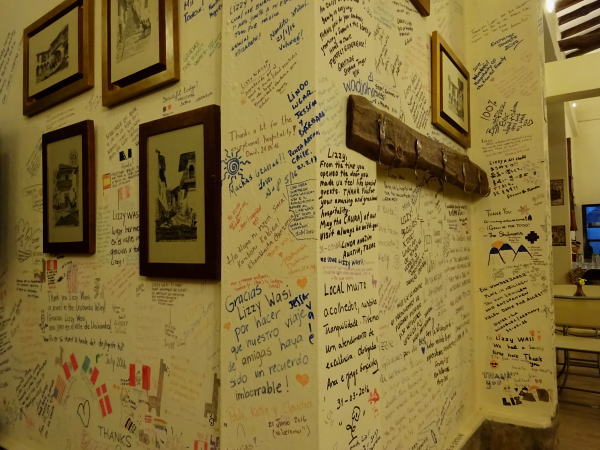 レストランの壁は一面宿泊者の記念サインでいっぱい。 |
