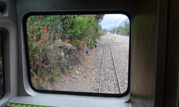 6:50マチュピチュに向け単線の上を列車が発車する。行く先方向は青空が見え、好天の下でマチュピチュの景観が見られるかと期待に胸が躍る。