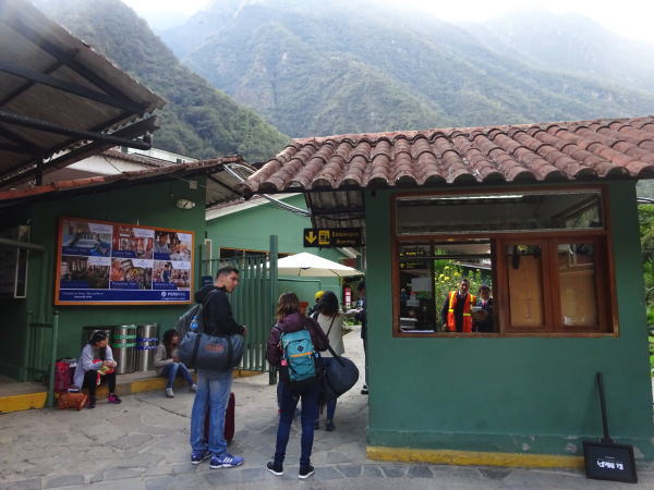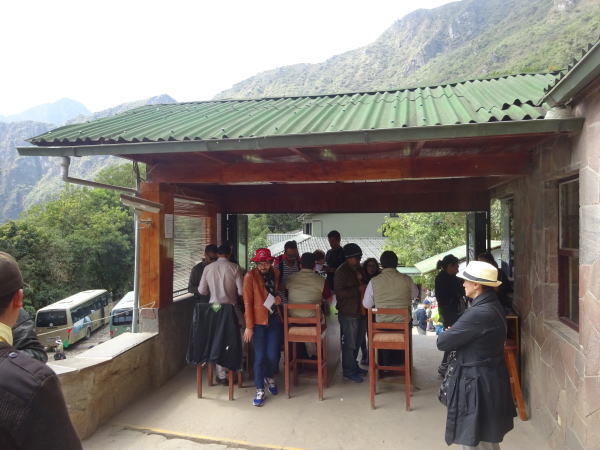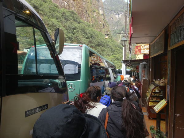 橋の向こうにマチュピチュバス乗り場で、すでに行列ができていた。バスのチケットは購入済みなので列の後ろについて3台目のバスに乗車。