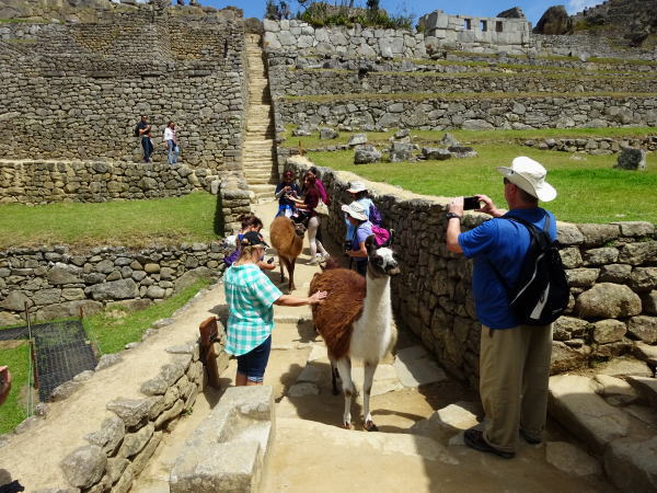 帰りの途中で遺跡内を散歩するリャマ/アルパカと遭遇