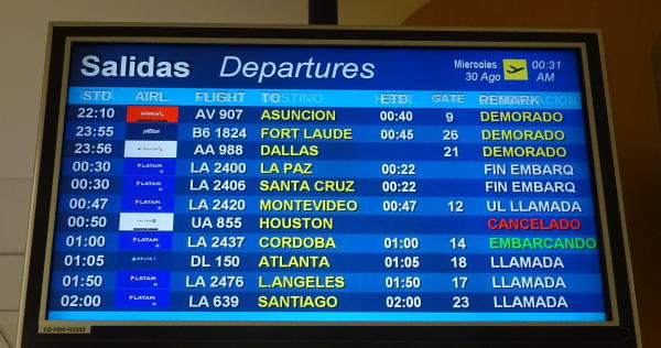リマ空港からダラス行AA988便が出航遅延の表示、そしてヒューストン行はハリケーンの影響だろう欠航。嫌~な予感がする。しかしこの後それが的中することになる。
