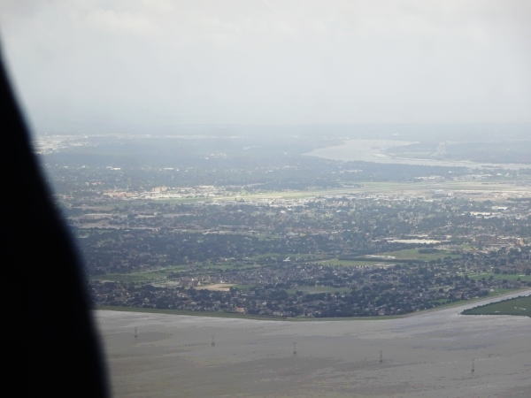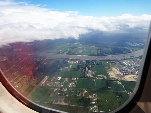 窓から見るニューオリンズ行の街はハリケーンの影響なのだろうか水に覆われているようにも見える。