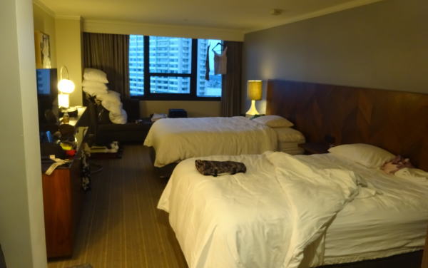 到着ロビーを出てタクシー乗り場へ。乗り合いバスで行くことも予定していただ飛行機が遅れたのでタクシーでホテルまで行くことにする。30分程でホテルに到着、タクシーにチップ込みで55㌦。少し多くあげすぎたかな。