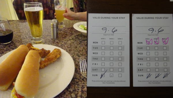 夕方に今日もホテルのヴッフェのサービスでビール&カクテルをご馳走になる。
