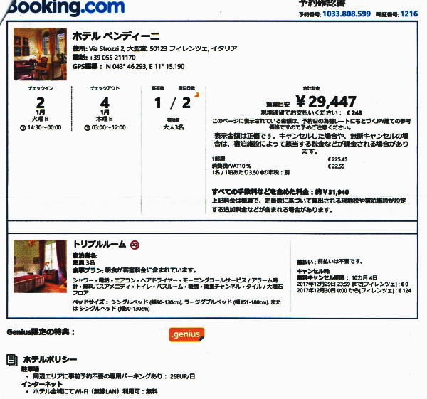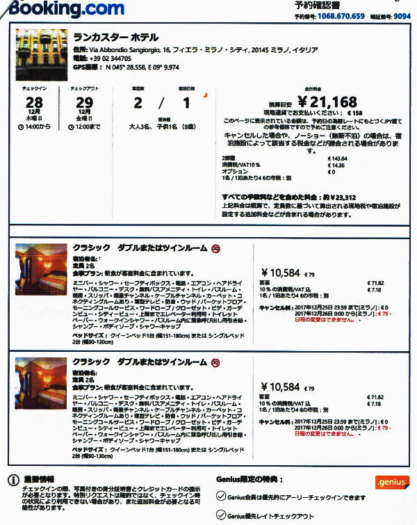 ミラノHotel 2017年12月28日~3泊 2部屋 |