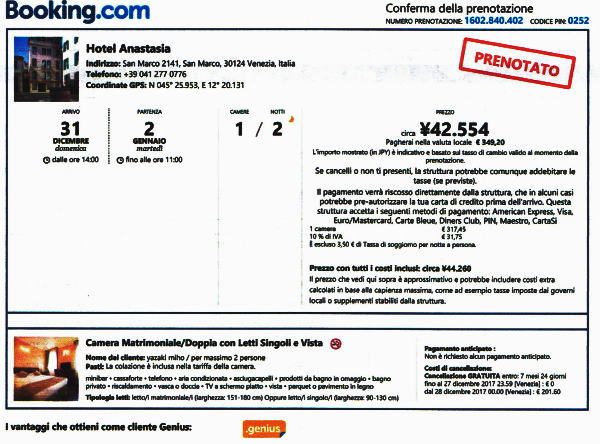 ヴェネチアHotel 2017年12月31日~2泊 2人用 |